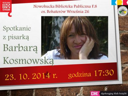 Biblioteka zaprasza na spotkanie autorskie z Barbarą Kosmowską w cyklu: Tu czytamy. Barbara Kosmowska popularna autorka książek dla dorosłych, młodzieży i dzieci, której powieści zdobyły wiele prestiżowych nagród. Książka "Buba" w 2002 r. zdobyła nagrodę główną w ogólnopolskim konkursie na powieść dla dzieci i młodzieży pod hasłem Uwierz w siłę wyobraźni zorganizowanym przez wydawnictwa Muza i Media Rodzina. Została również nagrodzona w Konkursie Literackim im. Astrid Lindgren, zorganizowanym przez Fundację ABCXXI – Cała Polska czyta dzieciom, pod patronatem Ministra Kultury i Dziedzictwa Narodowego. W 2001 wygrała konkurs literacki pod nazwą Dziennik polskiej Bridget Jones. Barbara Kosmowska jest także autorką słuchowisk dla dzieci i młodzieży.