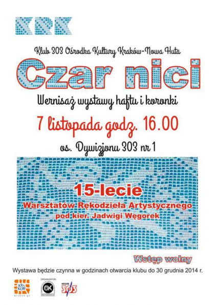 Klub 303 Ośrodka Kultury Kraków-Nowa Huta (os. Dywizjonu 303 nr 1) zaprasza 7 listopada 2014 r. o godz. 16.00 na wernisaż wystawy prac hafciarskich i koronkarskich powstałych w ramach Warsztatów Rękodzieła Artystycznego Czar nici, prowadzonych przez Jadwigę Węgorek.