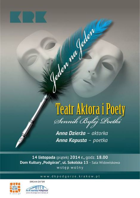 Spotkanie z autorką i aktorką to element „teatru aktora i poety”, gdzie najważniejszym bohaterem wieczoru będzie tekst – jego interpretacja aktorska, odbiór przez publiczność, a także przedstawienie przez poetkę własnych zamierzeń. Ten, niekonwencjonalny sposób „rozmowy wierszami” i „rozmowy o poezji” rozpocznie nieregularne, ale systematyczne czytania preformatywne w ramach spotkań z literaturą w Podgórzu:"Literatura w Podgórzu - Polubisz".