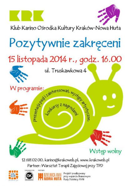 Pozytywnie zakręceni to nasi sąsiedzi, o których często tak mało wiemy, to także ci, którzy swój wolny czas poświęcają na pracę na rzecz innych lub oddają się wyjątkowemu hobby. W imprezie weźmie udział także młodzież z Warsztatów Terapii Zajęciowej. W programie spotkania prezentacja pasji i zainteresowań, występy artystyczne, konkursy i zabawy z nagrodami. Impreza finansowana jest ze środków Rady Dzielnicy XVIII Nowa Huta.