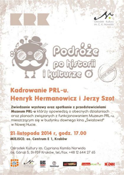 Dzięki uprzejmości Muzeum PRL-u (w organizacji) serdecznie zapraszamy na wspólne zwiedzanie wystawy „Kadrowanie PRL-u. Henryk Hermanowicz i Jerzy Szot” oraz spotkanie na którym przedstawiciele instytucji powiedzą o obecnych działaniach oraz planach związanych z funkcjonowaniem Muzeum PRL-u, mieszczącym się w budynku dawnego kina „Światowid” w Nowej Hucie.