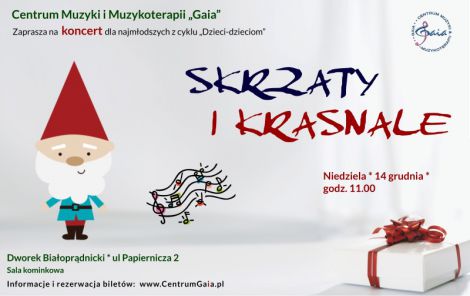 Koncert "Skrzaty i Krasnale" z cyklu "Dzieci - Dzieciom" odbędzie się 14 grudnia (niedziela), o godz. 11:00, w Sali Kominkowej Centrum Kultury "Dworek Białoprądnicki" (ul. Papiernicza 2) w Krakowie.