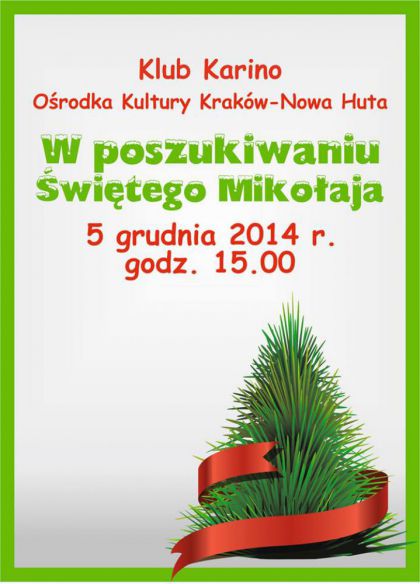 Święty Mikołaj zbliża się wielkimi krokami. Podczas mikołajkowego spotkania dzieci w Klubie Karino Ośrodka Kultury Kraków-Nowa Huta (ul. Truskawkowa 4) 5 grudnia 2014 r. o godz. 15.00 własnoręcznie wykonają ozdoby z bibuły, orzechów i ciasta solnego, którymi później przystroją świąteczne drzewko. Następnie wspólnie wyruszą na poszukiwanie Świętego Mikołaja i Śnieżynki oraz ukrytych prezentów. W tym dniu każdy będzie mógł poczuć się jak Mikołaj podczas wspólnych zabaw przy choince.