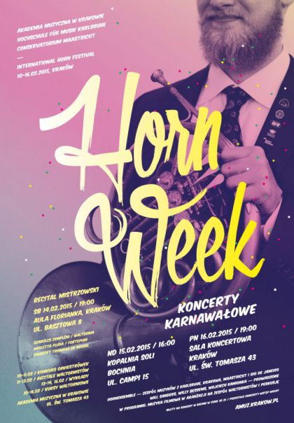 W dniach 10-16 lutego 2015 r. Akademia Muzyczna w Krakowie zaprasza na Międzynarodowy Festiwal Waltorniowy HornWeek Kraków 2015. Cieszący się światową renomą International Horn Festival HornWeek jest festiwalem organizowanym corocznie od 2004 roku w Niemczech i Holandii, zaś w lutym dołączy do niego klasa waltorni Akademii Muzycznej w Krakowie. Czynny udział w projekcie HornWeek weźmie 41 młodych waltornistów – studentów z Akademii Muzycznych w Krakowie, Karlsruhe, Maastricht i Rio de Janeiro.