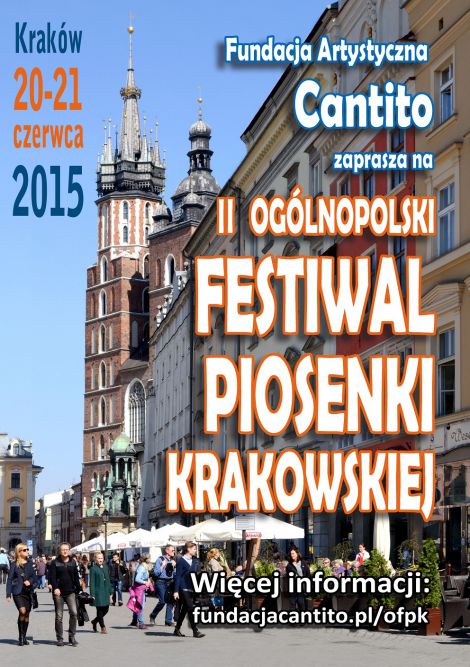 Już po raz drugi Fundacja Artystyczna Cantito ma zaszczyt serdecznie zaprosić Państwa na Ogólnopolski Festiwal Piosenki Krakowskiej, który odbędzie się w dniach 20-21.06.2015 r. w Krakowie.