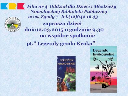 W cyklu: Opowiem Ci o moim regionie odbędzie się spotkanie w bibliotece pn.„Legendy grodu Kraka”. Dzieci poznają dwie legendy związane z Krakowem. Czytanie będzie połączone z zabawami ruchowymi, a także z zajęciami plastycznymi. Spotkanie dla 5-7 latków.