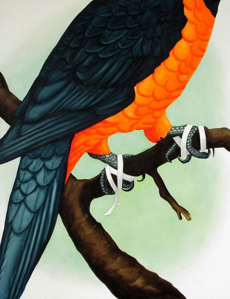 Woodland to także nazwa materiału maskującego typu moro, co nawiązuje do motywu przykrywania, ukrywania się pod tkaniną. Inspiracją do powstania tych obrazów były stare grafiki przedstawiające zwierzęta w typowych dla nich sytuacjach. Często wyrwane z szerszego kontekstu, skoncentrowane na przedstawieniu danego motywu. Zainspirował mnie również wczesnorenesansowy sposób przedstawiania draperii w niemal abstrakcyjny sposób”.