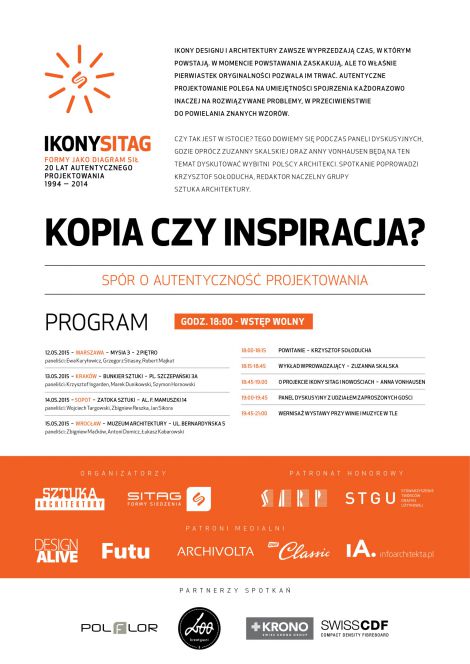 Czy w świecie masowego mieszania się informacji można jeszcze wskazać, do kogo należy pomysł ? Czy zagraża to oryginalności, która przestaje być wyznacznikiem jakości w architekturze i designie ? Odpowiedzi na te i inne pytania będziemy szukać podczas paneli dyskusyjnych organizowanych w całym kraju przez Grupę Sztuka Architektury oraz firmę SITAG Formy Siedzenia, organizatora kampanii "Ikony SITAG".