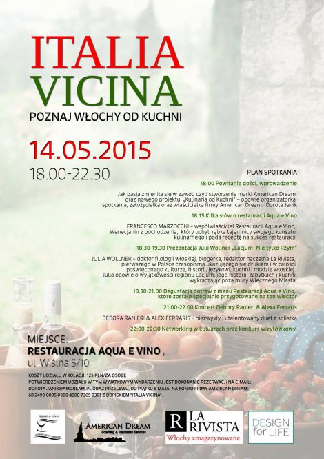 Firma American Dream wraz z Restauracją „Aqua e Vino” serdecznie zapraszają na ucztę dla zmysłów. Będzie to wyjątkowa okazja, aby poznać kulinarne tajemnice Włoch i zasmakować specjałów szefa kuchni najlepszej restauracji w kategorii kuchnia włoska według rankingu Dziennika Polskiego za rok 2014.