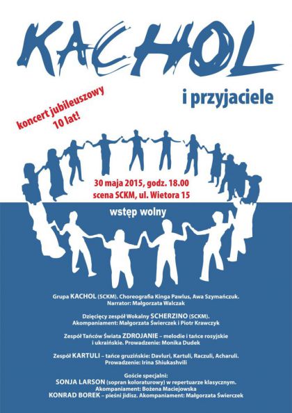 Zapraszamy na jubileusz grupy KACHOL, który odbędzie się 30.05.2015 o godzinie 18:00 w Staromiejskim Centrum Kultury Młodzieży w Krakowie. W programie występy zespołu dziecięco-wokalnego Scherzino, Tańców Świata Zdrojanie oraz zespołu Kartuli. Goścmi specjalnym będą Sonja Garson (sporan koloraturowy) oraz Kon rad Borek – pieśni idisz. Wstęp wolny!!