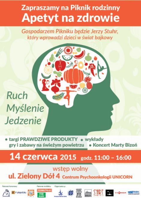 14 czerwca (niedziela) to dzień, w którym każdy mieszkaniec Krakowa będzie mógł najeść się zdrowiem do syta. W Centrum Psychoonkologii UNICORN w Krakowie (ul. Zielony Dół 4) odbędzie się Rodzinny Piknik APETYT NA ZDROWIE. Celem spotkania jest szeroko rozumiana profilaktyka zdrowia i promocja zdrowego stylu życia. Wydarzenie kierowane jest do wszystkich mieszkańców Krakowa, a w szczególności rodzin z dziećmi oraz osób starszych.