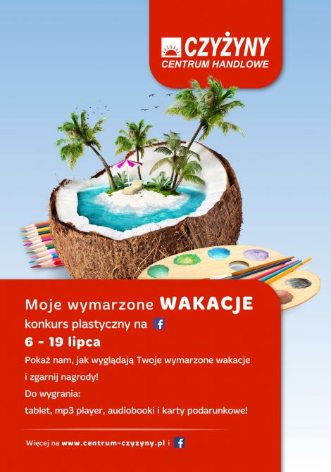 W dniach 6-19 lipca na fanpage’u Centrum Handlowego Czyżyny na Facebooku odbywał się będzie konkurs plastyczny „Moje wymarzone wakacje”, w którym wygrać można nagrody takie jak: tablet, MP3 player, audiobooki czy karty podarunkowe.