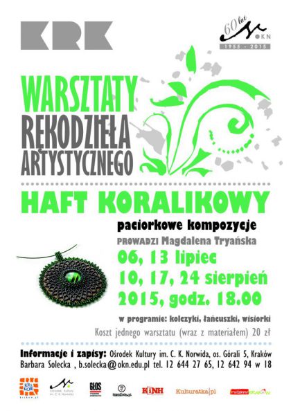 Na zajęciach haftu koralikowego w Ośrodku Kultury Norwida uczestnicy będą mogli stworzyć oryginalne i niepowtarzalne wisiorki, kolczyki lub naszyjniki. Serdecznie zapraszamy!