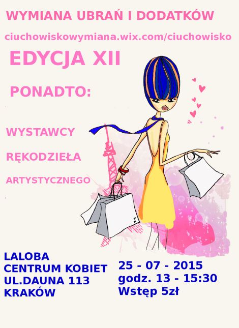 Kolejna edycja szalonej wymiany ubrań i dodatków czyli Krakowskiego Ciuchowiska. Tym razem spotykamy się ponownie w LaLoba Centrum Kobiet na ul.Dauna 113. Na stali duże lusta, dobre światło i przestrzeń do wymiany. Wymiana odbywać się będzie na stołach. Na miejscu barek z piciem i jedzonkiem:)