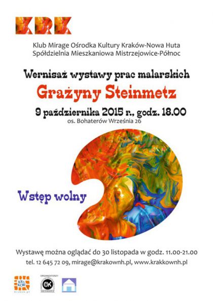 Klub Mirage Ośrodka Kultury Kraków-Nowa Huta (os. Bohaterów Września 26) zaprasza 9 października o godz. 18.00 na wernisaż obrazów Grażyny Stenimetz.