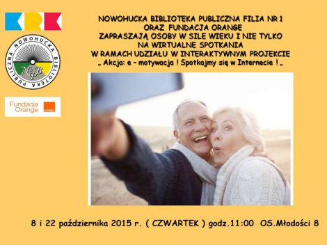 Filia nr 1 Nowohuckiej Biblioteki Publicznej w Krakowie uczestniczy w projekcie Fundacji Orange AKCJA: E-MOTYWACJA, której celem jest poszerzenie oferty edukacyjnej Biblioteki o innowacyjne zajęcia dla osób starszych oraz ich aktywizacja i wspieranie w rozwoju osobistym i społecznym. Biblioteka zaprasza wszystkich Seniorów i nie tylko na wirtualne spotkania. Internet i nowe technologie będą wykorzystane jako narzędzie do odkrywania świata i pokonywania społecznych barier. Uczestnicy spotkania połączą się ze studiem za pośrednictwem Internetu i obejrzą transmitowane przez Fundację Orange spotkanie online, którego gościem będzie pisarka i felietonistka Krystyna Kofta. Będą też mieć możliwość zadawania pytań.