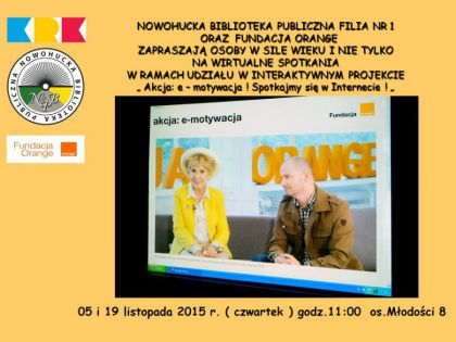 Filia nr 1 Nowohuckiej Biblioteki Publicznej w Krakowie i Fundacja Orange zapraszają seniorów na innowacyjne zajęcia. Spotkania odbywają się ramach projektu „Akcja: e-motywacja! Spotkajmy się w Internecie!”. Uczestnicy spotkania, przy pomocy nowoczesnych technologii, połączą się ze studiem w Warszawie i wezmą udział w wirtualnym spotkaniu z aktorką Heleną Norowicz, która w wieku 80 lat została modelką. Uczestnicy będą mogli zadawać pytania na specjalnie w tym celu przygotowanym czacie.