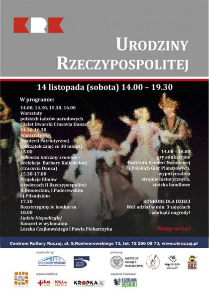 Zapraszamy na IV edycję obchodów Święta Niepodległości na Ruczaju. W programie atrakcje dla dzieci, młodzieży i dorosłych. Nie zabraknie gier i zabaw, warsztatów, a także prelekcji i koncertu! Dzieci zachęcamy do wzięcia udziału w konkursie na najaktywniejszego uczestnika Urodzin!