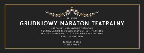 Stowarzyszenie All In UJ z dumą zaprasza na swoje flagowe wydarzenie, czyli Maraton Teatralny. Najbliższa- grudniowa edycja wprowadzi tę inicjatywę na zupełnie nowy poziom teatralnej jakości. Po raz pierwszy zaproszeni artyści zagoszczą na profesjonalnej scenie Krakowskiego Teatru Variété. Już 16 XII o godzinie 18:00 wystąpią grupy, których na co dzień w Krakowie zobaczyć nie można: