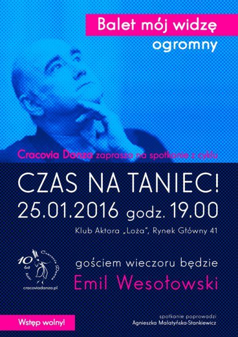 Choreograf, pedagog, tancerz i reżyser, jeden z najważniejszych twórców na polskiej scenie baletowej XX i XXI wieku, Emil Wesołowski będzie gościem najbliższego spotkania z cyklu CZAS NA TANIEC!, które odbędzie się 25 stycznia, tradycyjnie o godz. 19 w Klubie Aktora „Loża”.