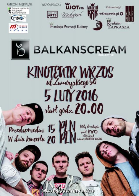W ostatni piątek tegorocznego karnawału warto wybrać się do kinoteatru „Wrzos” na krakowskim Podgórzu , by poczuć bałkańsko-hiphopowe klimaty. Już 5 lutego zimową atmosferę będzie podgrzewał zespół BALKANSCREAM, dając upust swoim bałkańskim fantazjom. W ten wieczór Podgórze zamieni Podgorice, a Wy możecie być nie tylko świadkami, ale i uczestnikami tego gorącego bałkańskiego wieczoru, w samym środku kalendarzowej zimy.