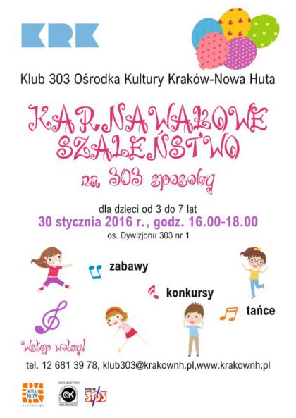 Zapraszamy do Klubu 303 Ośrodka Kultury Kraków-Nowa Huta (os. Dywizjonu 303 nr 1) na Karnawałowe szaleństwo. W radosnej i przyjaznej atmosferze dzieciaki będą miały okazję spędzić miło karnawałowy czas. W programie: zabawy, konkursy i tańce. Zapraszamy 30 stycznia br. na godz. 16.00.
