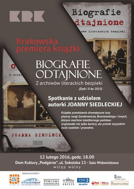 Zapraszamy na spotkanie autorskie z Joanną Siedlecką poświęcone jej najnowszej książce „Biografie odtajnione”. . Joanna Siedlecka to autorka wielu głośnych, wznawianych biografii polskich pisarzy, m.in. „Jaśnie panicza” o Witoldzie Gombrowiczu, „Mahatmy Witkaca” o Stanisławie Ignacym Witkiewiczu czy „Pana od poezji” o Zbigniewie Herbercie. W swoich ostatnich książkach „Obława. Losy pisarzy represjonowanych” i „Kryptonim »Liryka«. Bezpieka wobec literatów” zajrzała za kulisy życia literackiego w PRL-u, zapuszczając się w rewiry wstydliwie dotychczas omijane. W „Biografiach odtajnionych” kontynuuje ten wątek. Autorka przedstawia dramatyczne losy pisarzy rangi Gombrowicza, Broniewskiego i innych, którym machina totalitarnego państwa zrujnowała nie tylko kariery, ale przede wszystkim życie osobiste i prywatne. Zniszczyła zdrowie, rozbiła rodziny, wdarła się głęboko w cztery ściany ich domów, które nie były przystanią, ale nafaszerowaną podsłuchami pułapką.