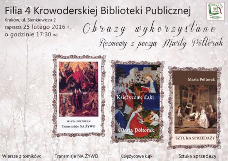 Marta Półtorak rocznik 76. Dziennikarka, poetka, historyk . Jej teksty ukazywały się na łamach : Fragile (2009,2011), LOUNGE Magazine (2009), Frazy (2010), Dziennika Polskiego (2011, 2016), Kwartalnika Stowarzyszenie Pisarzy Polskich za Granicą „Ekspresje”(2011), KRAKÓW (2011), Lamelli (2010-2016) oraz SYNEKDOCHA (2016) (publikacji pokonkursowej „300 słów o swoim wierszu” (2013), ARCANA (2014) oraz w krakowskich almanachach poetyckich w latach 2008 -2015. W lipcu 2009 ukazał się jej debiutancki arkusz poetycki Globalne Zadymy wydany przez Śródmiejski Ośrodek Kultury w Krakowie, a w marcu 2010 pierwszy samodzielny tomik poezji Transmisje NA ŻYWO wydany pod patronatem ŚOK oraz Kwartalnika FRAGILE. Drugi tomik „Księżycowe Łąki” wydała nakładem Wydawnictwa e-Bookowo (2012) wersji papierowej i e-book, podobnie najnowszy tomik „Sztuka Sprzedaży” (e-Bookowo 2015). Absolwentka Wydziału Humanistycznego Akademii Pedagogicznej w Krakowie na kierunkach : historia i dziennikarstwo. Należy do Stowarzyszenia Dziennikarzy Polskich.