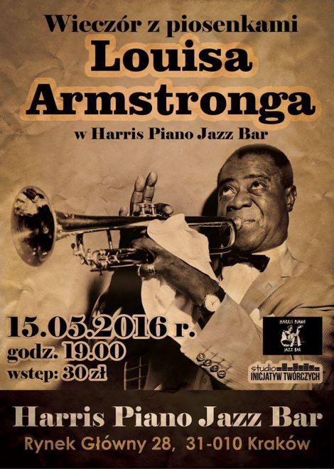 Serdecznie zapraszamy na wyjątkowy wieczór z piosenkami Louisa Armstronga w dniu 15.05.2016 r., o godz. 19.00 w Klubie Harris Piano Jazz Bar w Krakowie, Rynek Głowny 28.