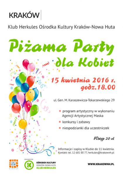 Klub Herkules Ośrodka Kultury Kraków-Nowa Huta (ul. Gen. M. Karaszewicza-Tokarzewskiego 29) zaprasza 15 kwietnia na godz. 18.00 na Piżama Party! Impreza tematyczna jest ciekawą odskocznią od nudnych i powszechnie organizowanych tzw. domówek. Tym razem będziemy bawić się w piżamkach, nocnych koszulkach lub dwuczęściowych flanelkach, szlafmycach z jaśkami, miśkami i w kapciach. Mimo tego, z całą pewnością nie będzie to senna impreza. Najlepsze piżamki oczywiście nagrodzimy!