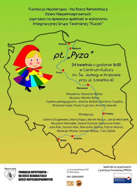 Integracyjna Grupa Teatralna "Kucyki" działająca w ramach Fundacji Hipoterapia - Na Rzecz Rehabilitacji Dzieci Niepełnosprawnych ma zaszczyt zaprosić Państwa na swój najnowszy spektakl "Pyza". Przedstawienie odbędzie się w niedzielę 24 kwietnia, o godzinie 16:00 w Centrum Kultury im. Św. Jadwigi w Krakowie, przy ul. Łokietka 60.