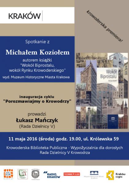 Rada Dzielnicy V Krowodrza, Krowoderska Biblioteka Publiczna - Wypożyczalnia dla dorosłych przy ul. Królewskiej 59 zapraszają na spotkanie autorskie z Michałem Koziołem, znawcą historii Krakowa, częstym gościem Radia Kraków, autorem książki „Wokół Biprostalu, wokół Rynku Krowoderskiego”. Jest to inauguracja cyklu „Porozmawiajmy o Krowodrzy”. Prowadzi Łukasz Mańczyk (Radny Dzielnicy V).