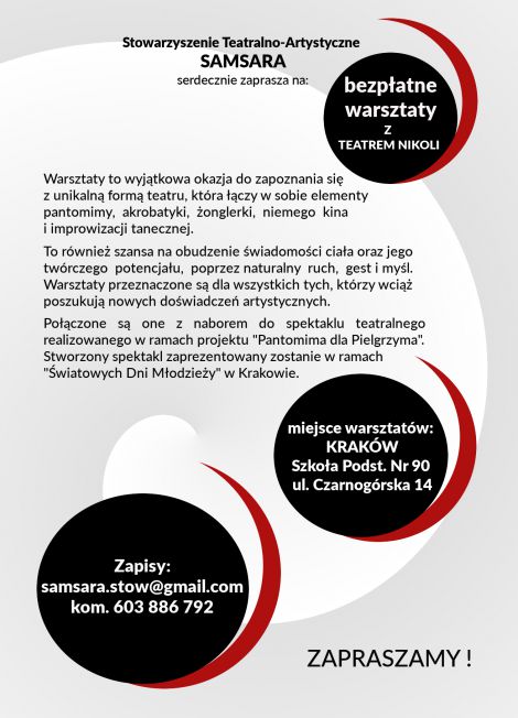 Ilość miejsc jest ograniczona. Zgłoszenia należy wysyłać na adres Stowarzyszenia Teatralno-Artystycznego „Samsara“: samsara.stow@gmail.com