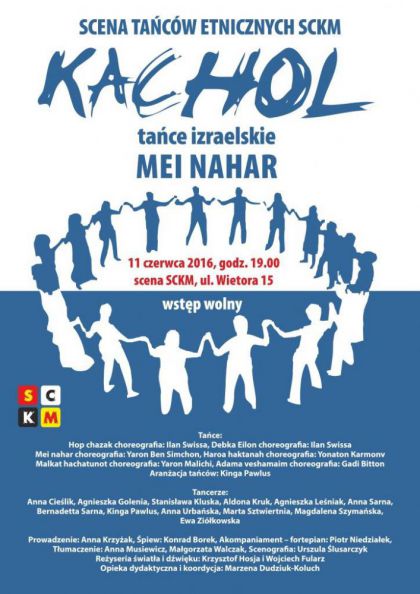 Grupa Kachol działająca w Staromiejskim Centrum Kultury Młodzieży ma zaszczyt zaprosić Państwa w taneczną podróż. Pasjonaci tańca pragną przedstawić Państwu różnorodność i piękno ludowych tańców Izraela. A tańce izraelskie posiadają pewien fenomen łączący w sobie wpływy różnych kultur, są nostalgiczne i pełne energii. Każdy może znaleźć w nich coś dla siebie. W programie tańce w stylu m.in. chasydzkim, jemeńskim oraz występ gościnny Konrada Borka, który uświetni koncert pieśniami w języku hebrajskim.