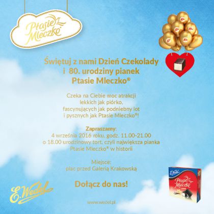 Już w najbliższą niedzielę 4 września będziemy obchodzić Międzynarodowy Dzień Czekolady, a także 80. urodziny kultowych pianek Ptasie Mleczko®. Z tej okazji marka E.Wedel zaprasza mieszkańców Krakowa do wspólnego świętowania. Na wszystkich uczestników czeka szereg atrakcji, m.in. skok w olbrzymie pudełko pianek Ptasie Mleczko®, fontanna czekoladowa, mnóstwo konkursów, a także… największa pianka w historii i wiele innych, niebiańskich niespodzianek. Warto przyjść i świętować ten dzień razem z nami!