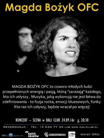 MAGDA BOŻYK OFC to czworo młodych ludzi przepełnionych energią i pasją, którą "zarażają" każdego, kto ich usłyszy. Mieszają style muzyczne w poszukiwaniu swojego własnego brzmienia. Muzyka, jaką wykonują nie jest łatwa do zdefiniowania - to fuzja rocka, emocji bluesowych, funky. Nie boją się Eksperymentowania i zmiany aranżacji, dlatego też grają elektrycznie lub akustycznie, często z towarzyszeniem sekcji dętej. Kto raz ich usłyszy, będzie wracał po więcej!