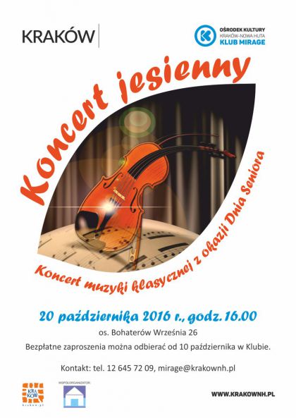Jesień to taki czas, kiedy najchętniej zasiadłoby się na kanapie pod kocem z dużym kubkiem ciepłej herbaty, dobrą czekoladą i książką. W pewnym momencie mówimy, że jedyne, co nas pociesza, to oczekiwanie na wiosenne słońce. Tyle, że jesień wcale nie musi tak wyglądać. Może w jesienne popołudnie warto posłuchać muzyki na żywo, na przykład muzyki klasycznej? Koncert proponowany przez Klub Mirage Ośrodka Kultury Kraków-Nowa Huta z okazji Dnia Seniora to znakomity sposób na to, by nie dopadła nas jesienna depresja, by wieczory nie dłużyły się w nieskończoność, żeby czas szarości, zimna i słoty był bardziej znośnym. Koncert odbędzie się 20 października o godz. 16:00 na os. Bohaterów Września 26. Organizatorzy zapraszają seniorów, aby w swoim gronie świętowali swój dzień przy dźwiękach pięknej muzyki.