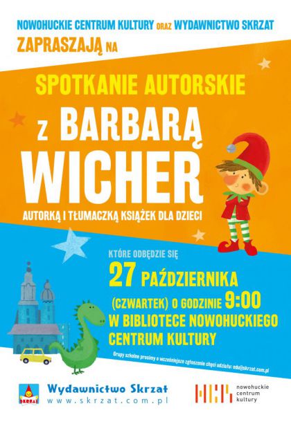 Spotkanie z Barbarą Wicher autorką wielu książek dla dzieci m.in. „Figi na wakacjach”, opowieści dla dzieci uczących się czytać, humorystycznych opowiadań „Przygody roztargnionej czarownicy” zawierających quiz sprawdzający umiejętność czytania ze zrozumieniem, przygodowej książki dla młodszych dzieci „Lena i Tonio, czyli świat, gdy ma się kilka lat”, a także serii Przygody Toffika. Jest również autorką proekologicznych tekstów o detektywie Łodydze.