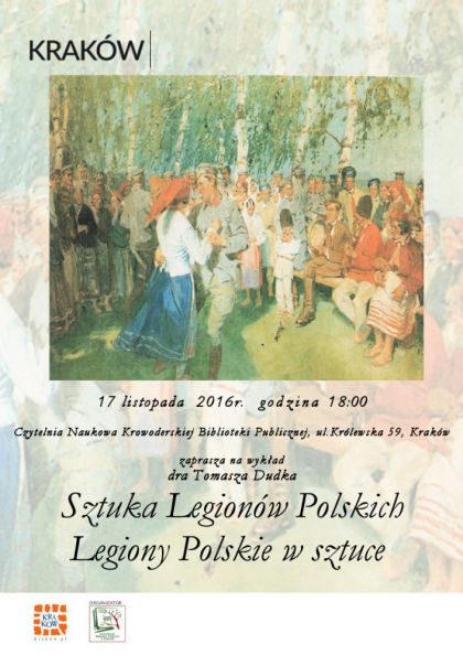 Biblioteka Główna, Czytelnia naukowa Krowoderskiej Biblioteki Publicznej przy ul. Królewskiej 59 zaprasza 17 listopada o godzinie 18:00 na wykład dra Tomasza Dudka "Sztuka legionów Polskich. Legiony Polskie w Sztuce".