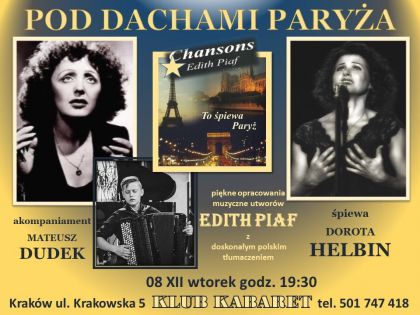 Piosenki z repertuaru Edith Piaf z akompaniamentem Mateusza Dudka (akordeon) zaprezentuje we wtorek 8 listopada na scenie Klubu Kabaret Dorota Helbin.