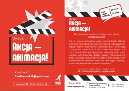 Uczestnicy piszą scenariusze, tworzą storyboardy – scenariusze obrazkowe, postacie i scenografię filmową. Następnie wykonują serię zdjęć, montują, udźwiękawiają, dodają muzykę. Podsumowaniem pracy są pokazy zrealizowanych filmów animowanych. Filmy zamieszczane są także na kanale You Tube. Zajęcia rozwijają wyobraźnię, kreatywność,zdolność obserwacji i budowania spójnego opowiadania. Warsztaty odbywają się w każdy czwartek od godziny 15.15 do 17.45.