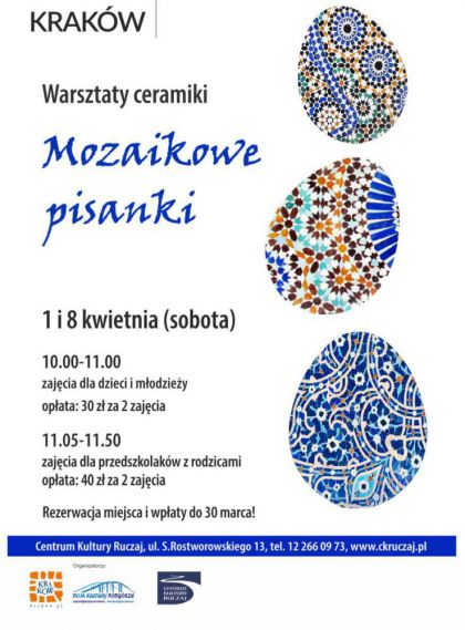 Informacje i zapisy w biurze Centrum Kultury Ruczaj od poniedziałku do piątku w godz. 11:00-21:00, soboty 9:30-14:00; tel. 12 266 09 73, biuro@ckruczaj.pl.