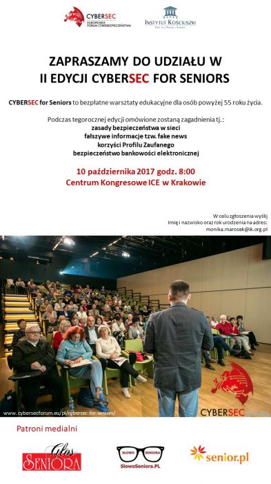 Już po raz drugi zapraszamy do udziału w bezpłatnych warsztatach CYBERSEC for Seniors, które odbędą się drugiego dnia konferencji CYBERSEC tj. 10 października 2017 w Centrum Kongresowym ICE w Krakowie. Wydarzenie rozpocznie się o godzinie 8:00.
