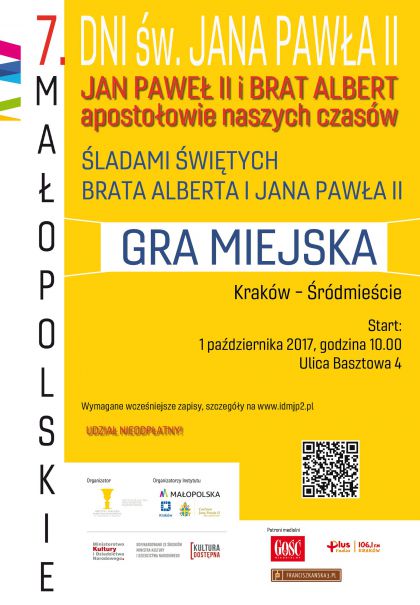 Tematyczna gra miejska realizowana jest w ramach Projektu pn. Jan Paweł II i Brat Albert - apostołowie naszych czasów. VII Małopolskie Dni Św. Jana Pawła II dofinansowanego ze środków Ministra Kultury i Dziedzictwa Narodowego w ramach programu „Kultura Dostępna”.
