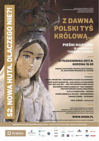 Po wakacyjnej przerwie, nowohucki cykl społeczno-kulturalny Nowa Huta. Dlaczego Nie?! zaprasza na kolejne wydarzenie. Tym razem Organizatorzy zapraszają do kościoła Matki Bożej Nieustającej Pomocy na os. Bohaterów Września 33, gdzie będzie można usłyszeć tradycyjne pieśni maryjne w aranżacjach autorstwa Tomasza Chmiela. Koncert odbędzie się w sobotę 21 października, początek o godz. 19.30.