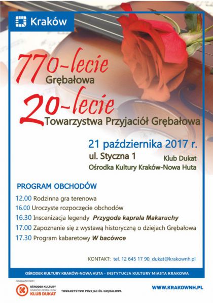 Klub Dukat Ośrodka Kultury Kraków-Nowa Huta (ul. Styczna 1) oraz towarzystwo Przyjaciół Grębałowa zapraszają w sobotę 21 października w godz. 12.00-18.00 na obchody 770-lecia Grębałowa i 20-lecia Towarzystwa Przyjaciół Grębałowa. Specjalnie z tej okazji mieszkańcy przygotowali wiele niespodzianek dla publiczności. Wydarzenie rozpocznie się osiedlową grą terenową o godz. 12.00. Część oficjalna rozpocznie się o 16.00 inscenizacją legendy Przygoda Kaprala Makaruchy w wykonaniu Klubowej Grupy Poetica. Gościnnie wystąpi Maciej Miezian - historyk sztuki, publicysta, pracownik Muzeum Historycznego Miasta Krakowa Oddział Dzieje Nowej Huty. O godzinie 17.00 nastąpi prezentacja wystawy historycznej złożonej z eksponatów udostępnionych przez mieszkańców osiedla, opracowanej przez Henryka Woźniaka - kolekcjonera, wieloletniego mieszkańca Grębałowa. Część oficjalną zakończy występ kabaretu dla dorosłych z programem W bacówce w wykonaniu aktorów sceny krakowskiej: Lucyny Rutkowskiej i Leszka Wilka.