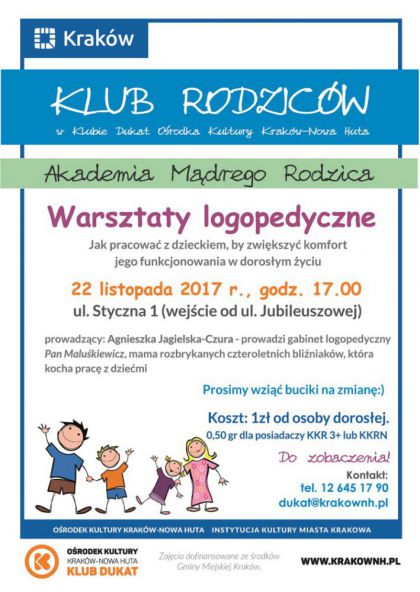 Klub Dukat Ośrodka Kultury Kraków-Nowa Huta (ul. Styczna 1) zaprasza na Warsztaty logopedyczne w Klubie Rodziców w środę 22 listopada w godz. 17.00-18.30. Spotkanie ze specjalistą w dziedzinie logopedii w ramach Klubu Rodziców. Zajęcia poprowadzi Pani Agnieszka Jagielska-Czura, mama rozbrykanych czteroletnich bliźniaków, która kocha pracę z dziećmi. Sama prowadzi gabinet logopedyczny Pan Maluśkiewicz, w którym pokazuje rodzicom jak pracować z dzieckiem, by zwiększyć komfort jego funkcjonowania w dorosłym życiu.