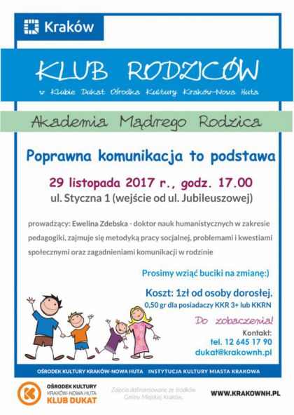 Klub Dukat Ośrodka Kultury Kraków-Nowa Huta (ul. Styczna 1) zaprasza w środę 29 listopada w godz. 17.00-18.30 na warsztaty dla rodziców na temat komunikacji. Spotkanie poprowadzi Ewelina Zdebska - doktor nauk humanistycznych w zakresie pedagogiki, adiunkt pracownik naukowo-dydaktyczny Instytutu Pracy Socjalnej Uniwersytetu Pedagogicznego w Krakowie. Zajmuje się metodyką pracy socjalnej, problemami i kwestiami społecznymi, instytucjami wsparcia społecznego oraz zagadnieniami komunikacji w rodzinie.