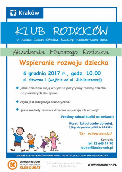 Wstęp: 1 zł od osoby dorosłej/zajęcia. Osoby posiadające Krakowską Kartę Rodzinną 3+ płacą 0,5 zł. Zajęcia dofinansowane ze środków Gminy Miejskiej Kraków.