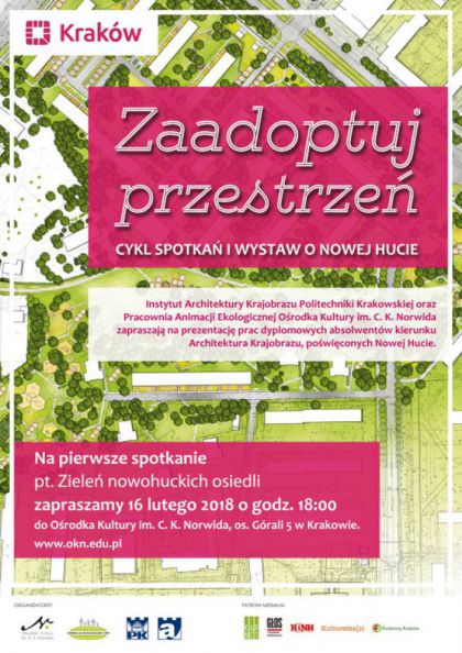 "Zaadoptuj przestrzeń" to cykl tematycznych spotkań i wystaw prezentujących prace dyplomowe studentów i absolwentów kierunku Architektura Krajobrazu Wydziału Architektury Politechniki Krakowskiej poświęcone różnym przestrzeniom publicznym Nowej Huty. Na okres od lutego do maja br. zaplanowano następujące tematy: